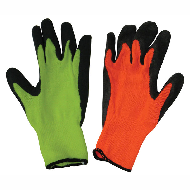 • Knit cotton / polyester gloves with knit liner and coated black latex palm Colors: Orange or Green
