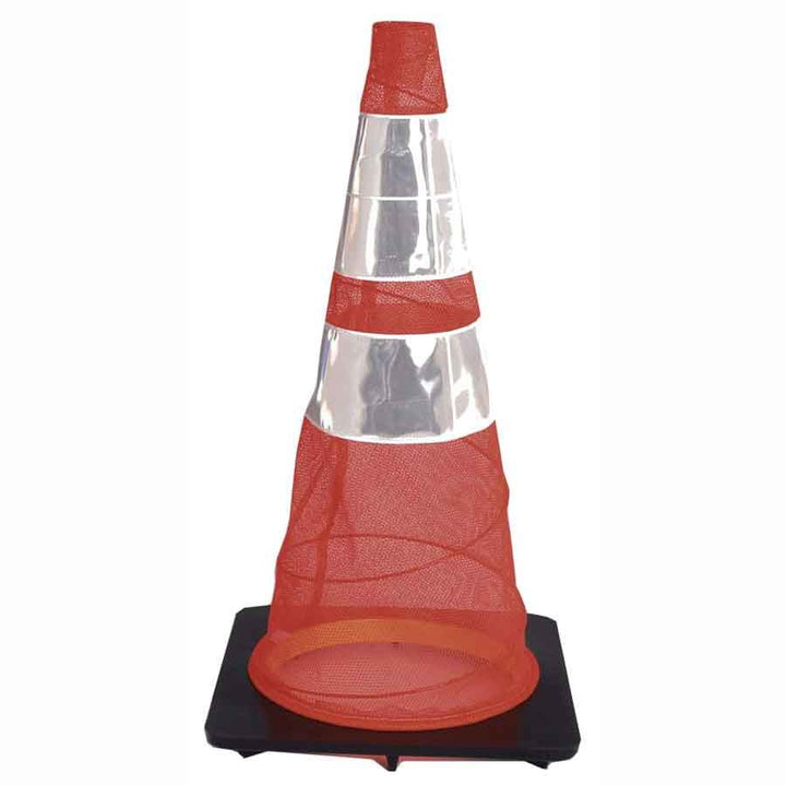 The Spring Cone is made of a durable, bright orange, flexible mesh material with a heavy duty rubber base. Spring Cones come standard with Reflexiteâ„¢ reflective cone collars. The flexible spring allows cone to automatically self deploy and spill wind for increased stability. The Rubber Base securely grips the road and holds cone in place in heavy traffic conditions. Cones come in 3 and 5 pound models.