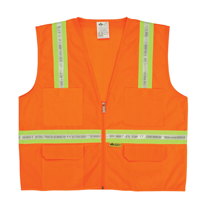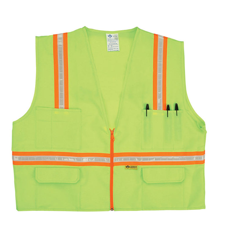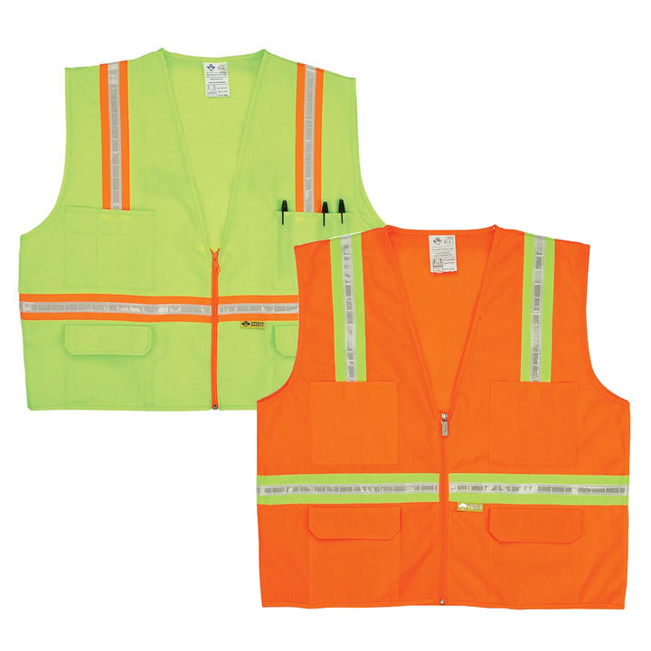 Our Surveyor's Safety Vest with Contrasting Stripes has two chest pockets for pens and tools, and two flap pockets inside and out. Choose fluorescent green with white-on-orange stripes or fluorescent orange with white-on-yellow stripes, both front and back. Sizes: M, L, XL, 2XL, 3XL, 4XL, 5XL. Minimum order one case of 36 vests.